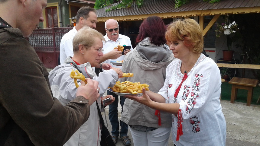 Gastgeschenke überreicht. Zum Abendessen gab es ein rumänisches Nationalgericht, Krautwickel mit einer Reis-Hackfleischfüllung. Danach wurde es ein sehr schöner Abend. Es wurde kräftig geschunkelt und getanzt. Das Trinken kam auch nicht zu kurz. Es gab Wasser (aus Boholt), Rot- und Weißwein, Bier und natürlich Zwetschgenschnaps.