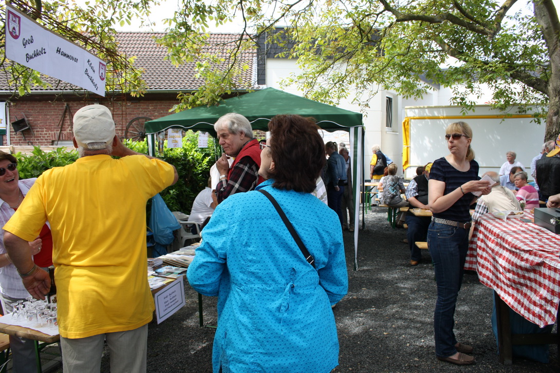 Direkt zu Beginn des Marktes stieß ein weiterer Gast zu uns. Herr Sticher aus Duisburg – Buchholz. Damit nahm erstmals ein Gast aus Duisburg – Buchholz an einem Treffen teil. Eine weitere Teilnehmerin, die erstmals teilnehmen wollte, Frau Murges – Maschial, aus Buchholz Büllingen, Belgien, musste wegen einer Erkrankung leider kurzfristig absagen. Der Wettergott war uns auch an diesem Nachmittag wohl gesonnen und ließ wider die Sonne scheinen. Der Markt war gut besucht und es wurde von den dargebotenen Produkten, die unsere Gäste aus ihrer Heimat mitgebracht hatten, kräftig umgesetzt. Nach Abschluss des Marktes kamen die Shuttlebusse wieder zum Einsatz. Sie brachten die Gäste in ihre Quartiere und holten sie auch rechtzeitig zum Festabend in der Waldesruh wieder ab. Der Festabend, der vom Dorf- und Heimatverein Buchholz gestaltet wurde, war sehr gut besucht. Leider hatte unser Wirt zu wenig Sitzplätze gestellt, so dass einige Gäste in die Wirtschaft und in den Biergarten ausweichen mussten. Zu Beginn gab es ein reichhaltiges Buffet. Der Vorsitzende des DuHV begrüßte die Gäste und führte anschließend durch den Abend. Zuerst erfreute der MGV die Gäste mit einer „Bergwanderung“ und zum Abschluss trat Inge Schmidt als Andres Berg auf. Es war ein begeisternder Playbackauftritt. Danach fuhren die Shuttlebusse alle Gäste wieder zu ihren Hotels.