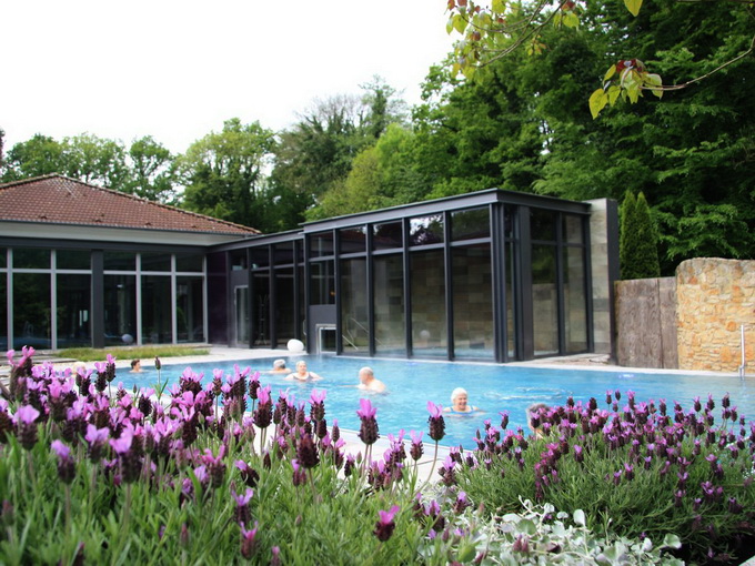 Modernes Badehaus mit Bewegungsbecken, Sauna, Massage- und Behandlungsräume. Hochwirksame Schwefelquellen, Bade- und Trinkkuren, seit 1823 angezeigt bei Rheuma, Gicht, Ischias und Frauenleiden.