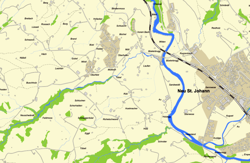 'Buechholz besteht aus einigen Eizelgehöften und Häusern. Es liegt von Neu St. Johann aus Richtung hinter Bühl.